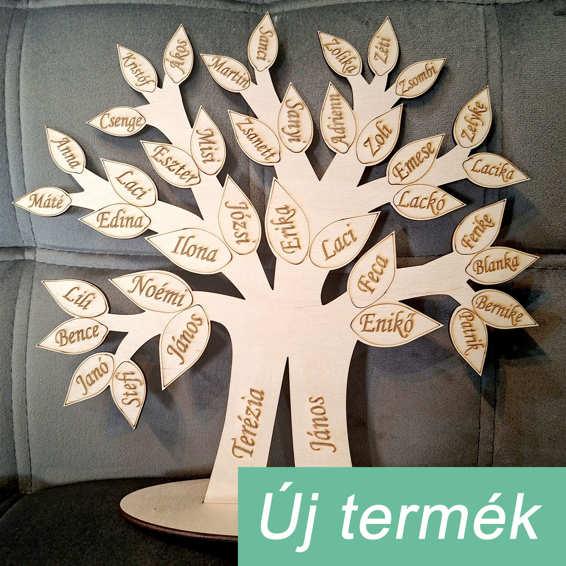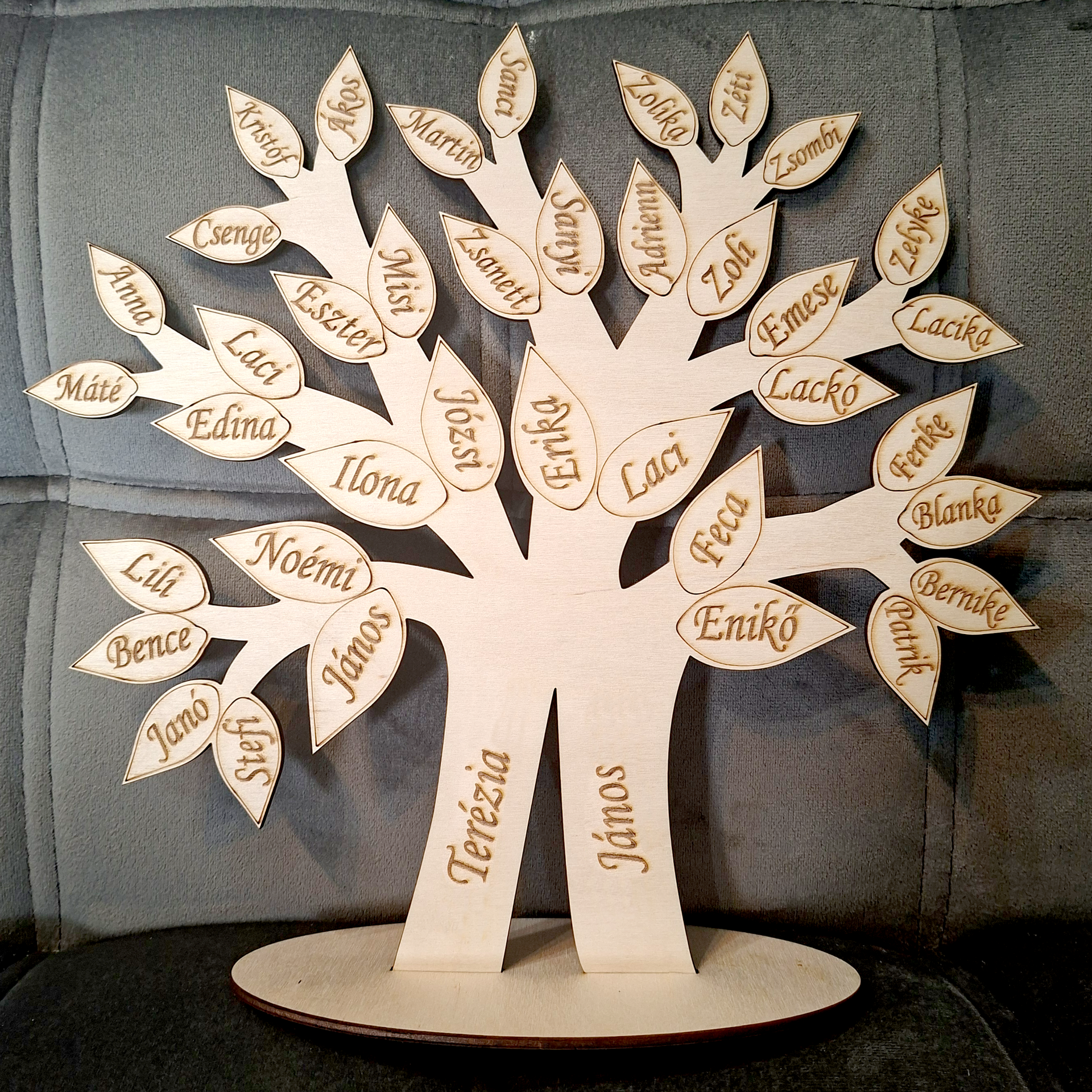 Egyedi gravírozott fa családfa, amelyen minden levél egy-egy családtag nevét őrzi. Természetes anyagból készült, esztétikus és személyes ajándék bármilyen alkalomra.