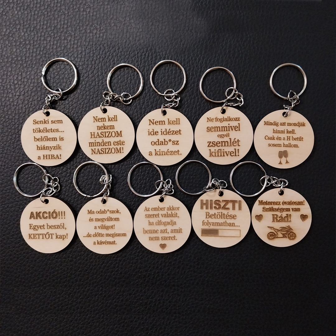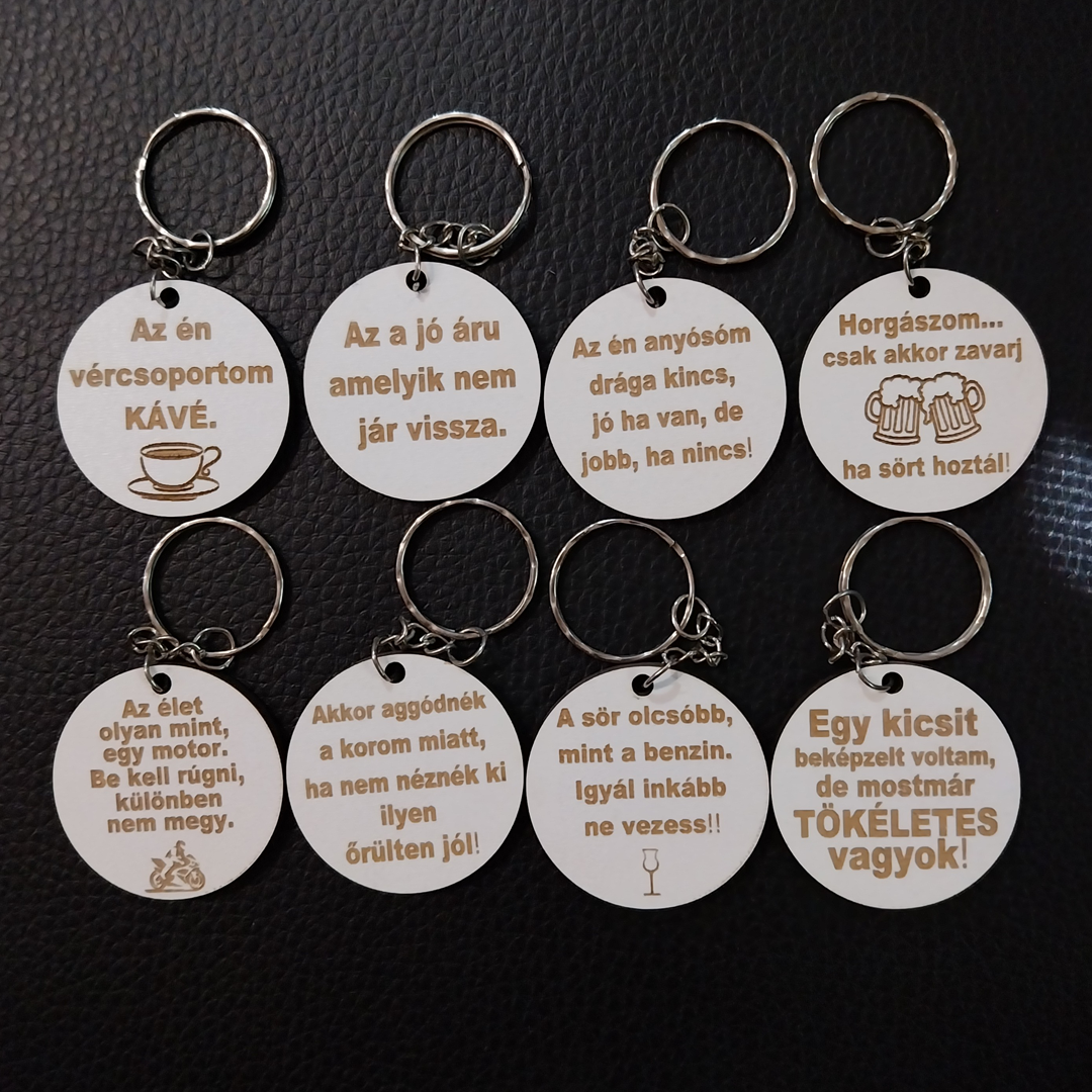 Egyedi neves/mintás/szöveges kulcstartók, natúr vagy fehér fából.