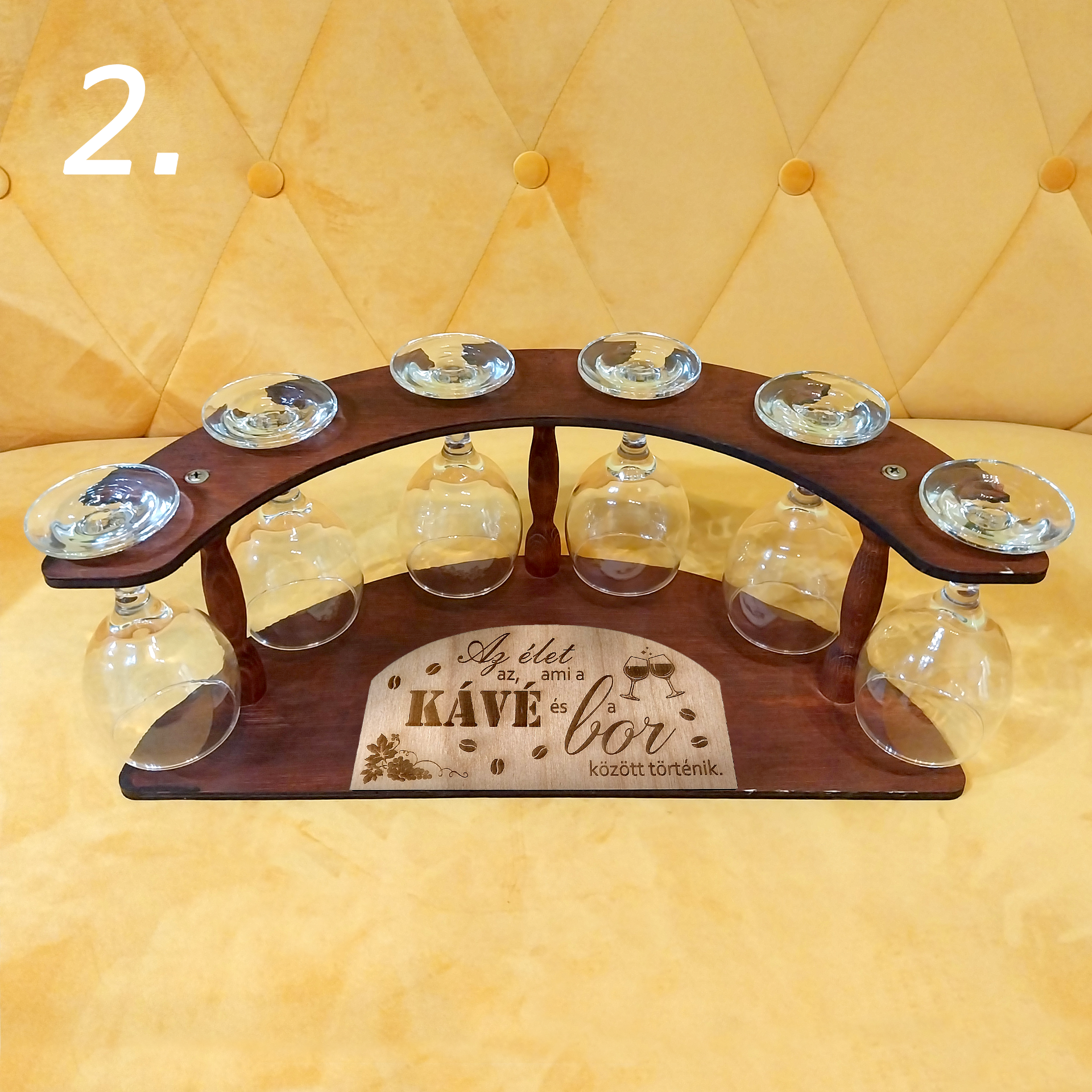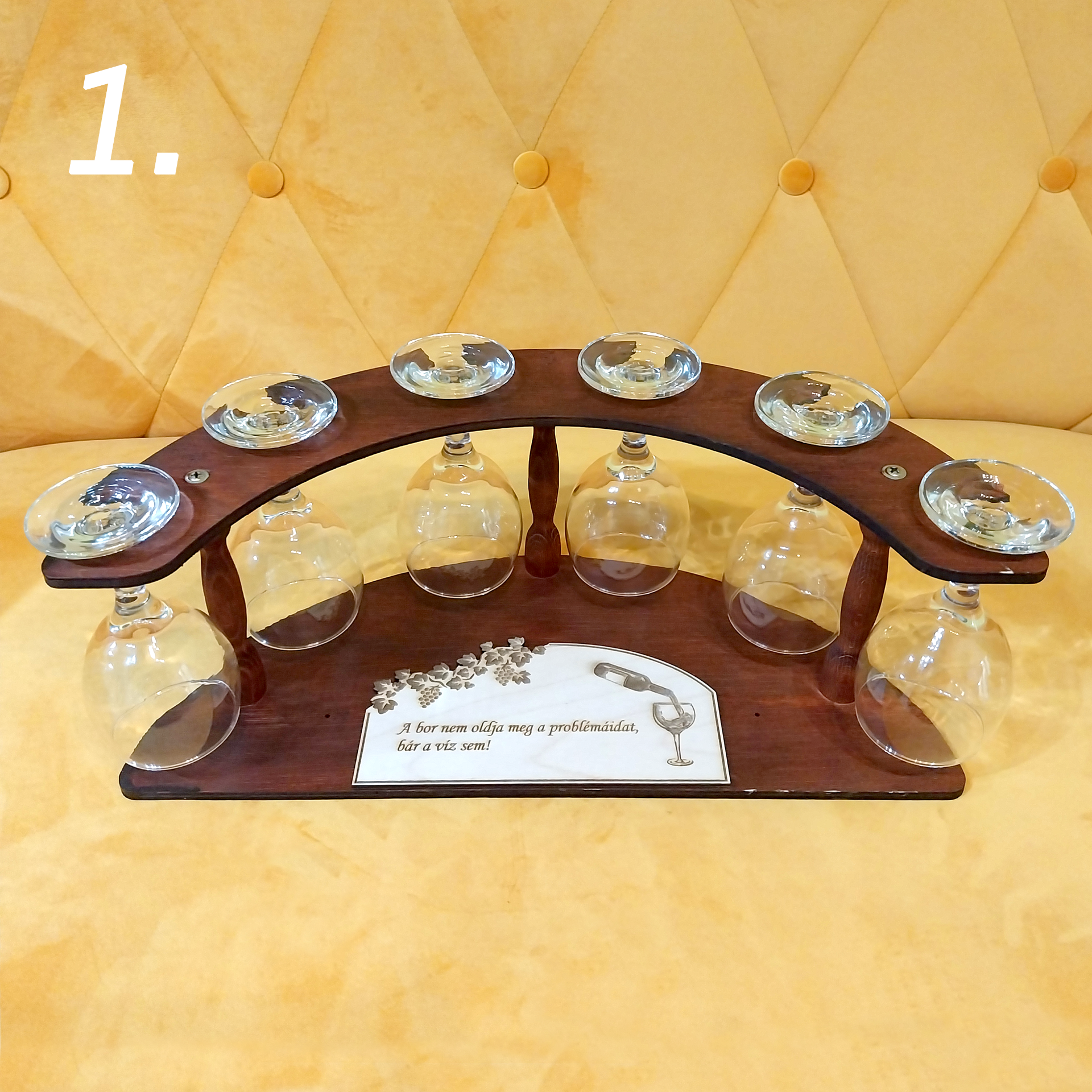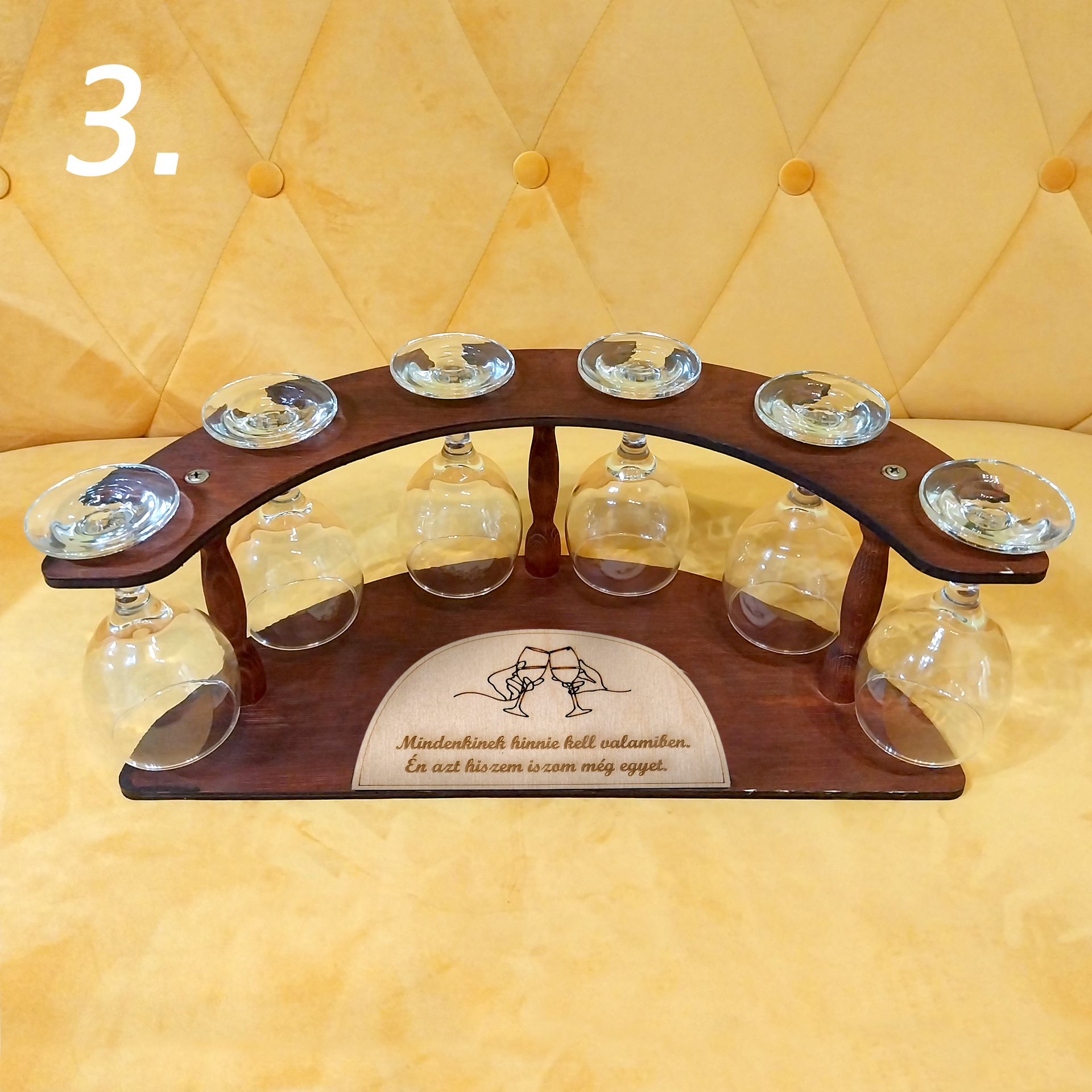 Stílusos, félkör alakú fa borospohártartó 6 pohárhoz, egyedi gravírozható táblával. Tökéletes ajándék vagy dekoratív kiegészítő otthonra. Egyedileg gravírozható szöggel és mintával kérhető. Írj bátran!