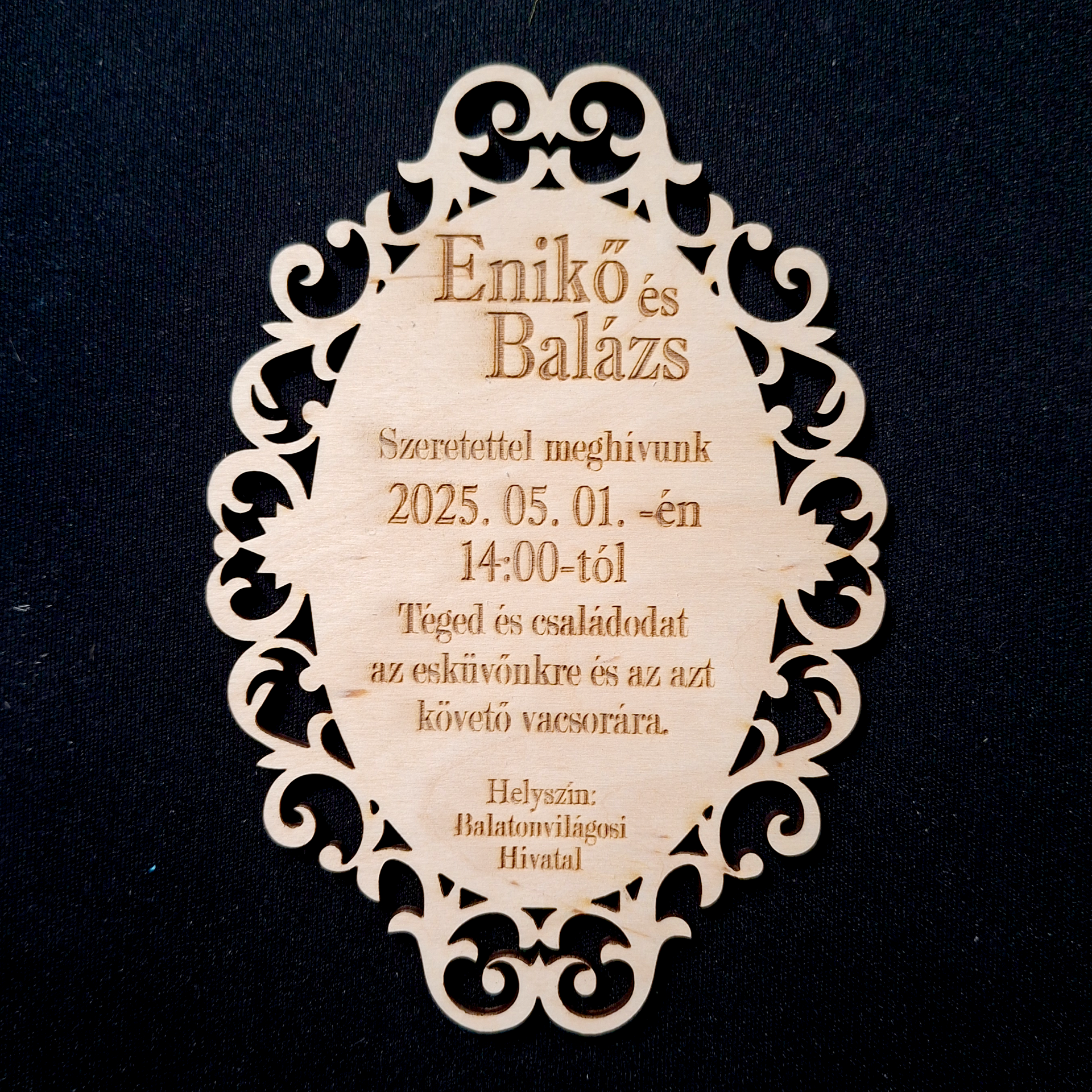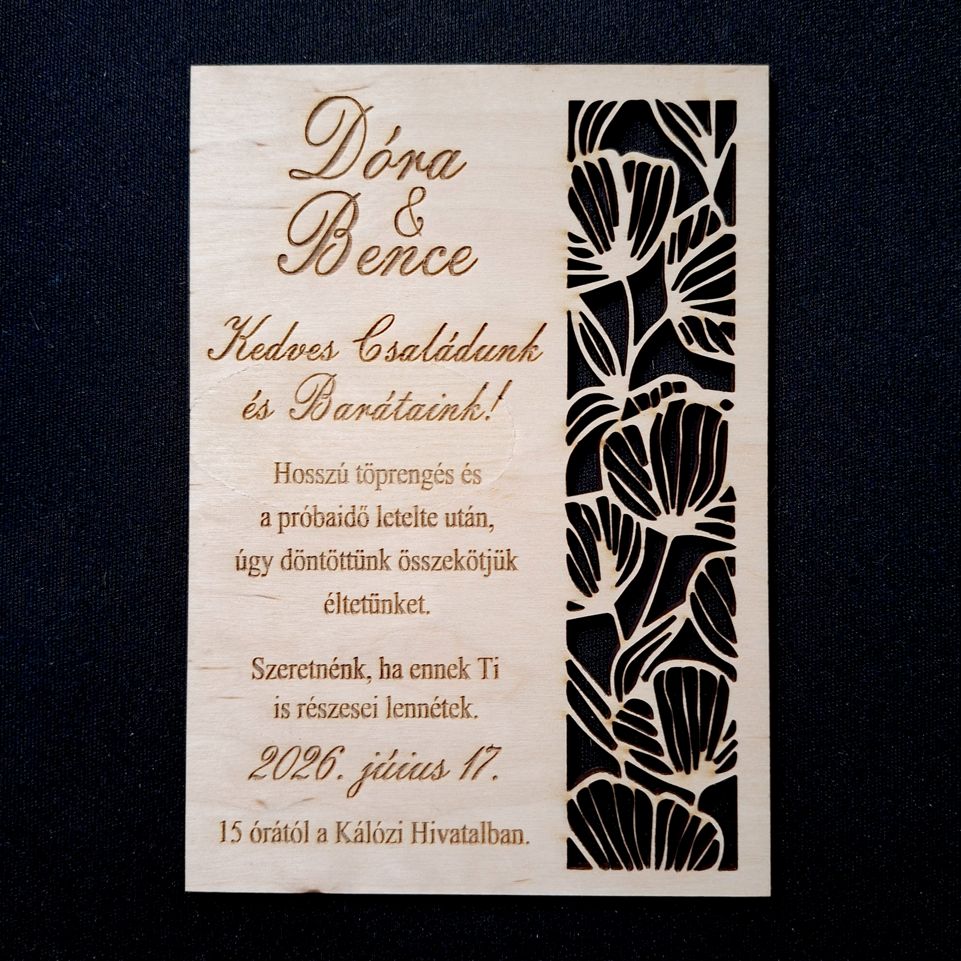 A gravírozott felület, a finom minták és az egyedi forma különleges hangulatot teremtenek már a meghívás pillanatában.