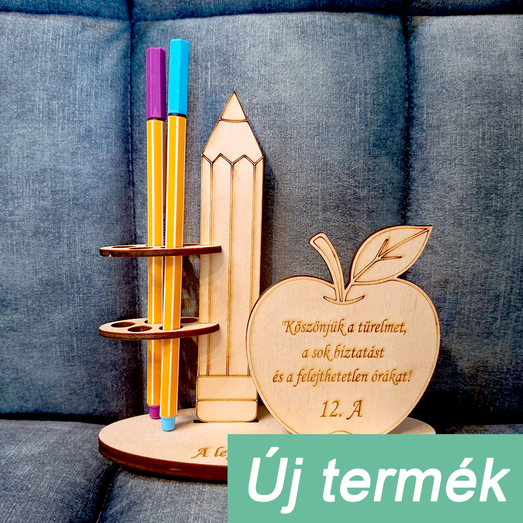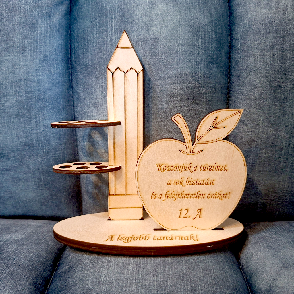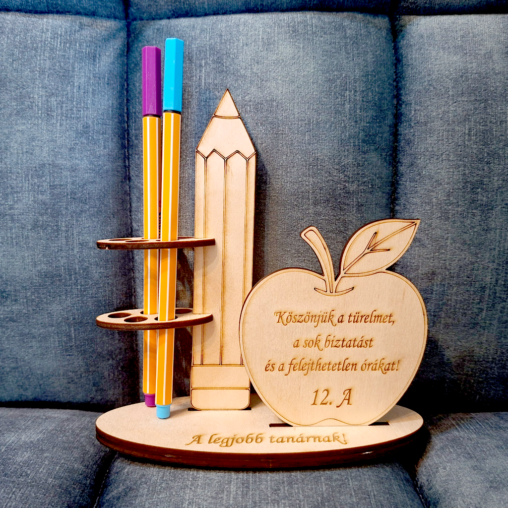 Ez a különleges, ceruza és alma motívummal készült fa tolltartó tökéletes ajándék egy szeretett tanár számára.