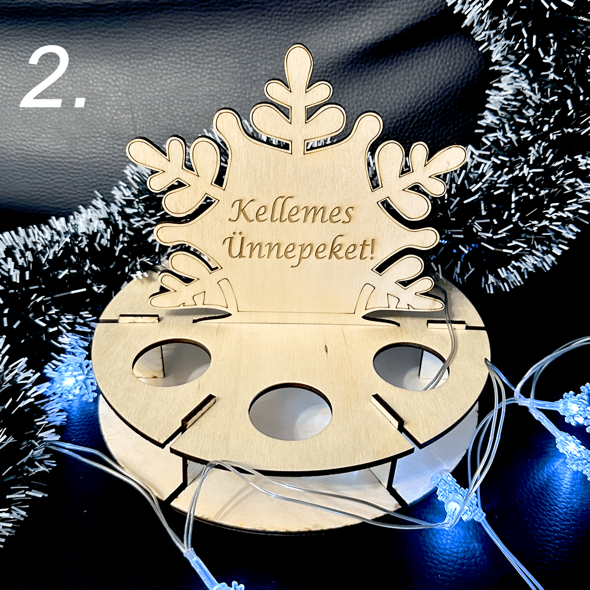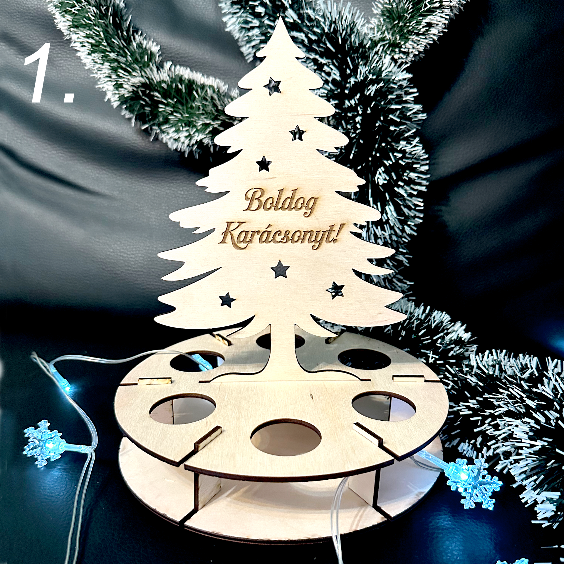 Stílusos, lézervágott fa pálinkáspohár tartó 6 üvegpohárral. Tökéletes az ünnepi asztalra vagy ajándéknak – hangulatos és egyedi kiegészítő a karácsonyi koccintáshoz.