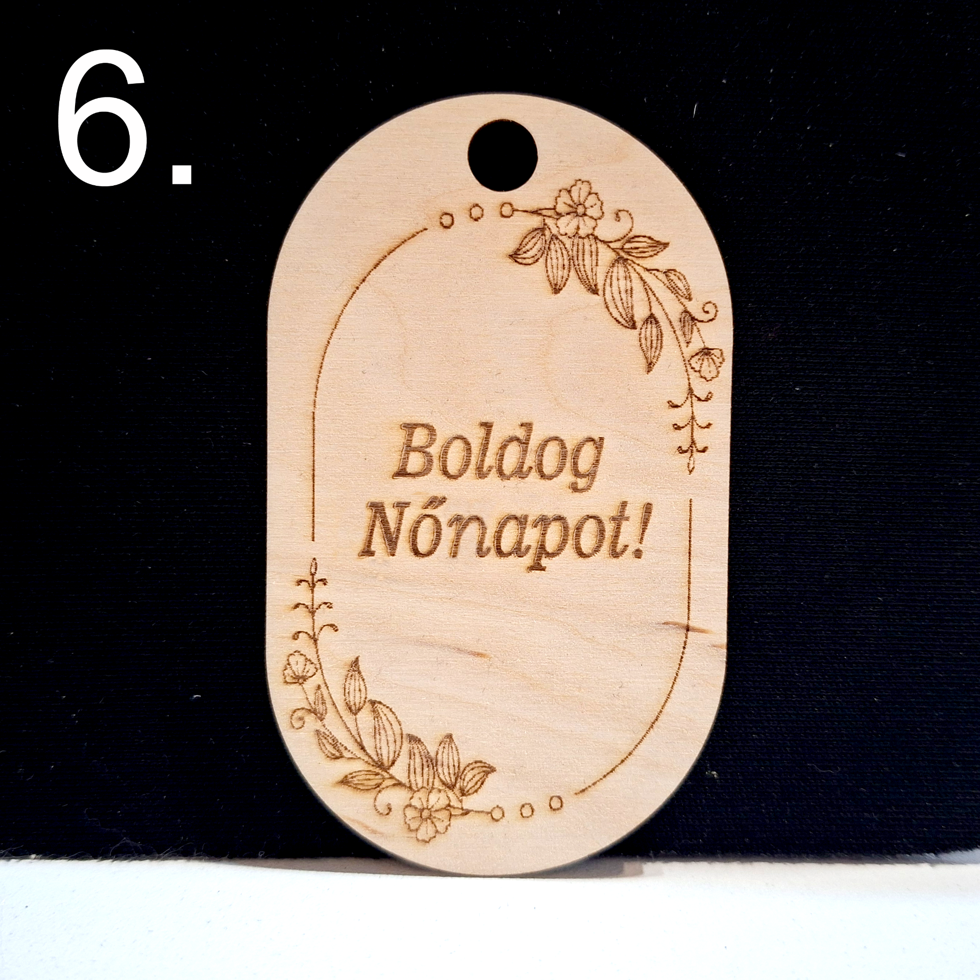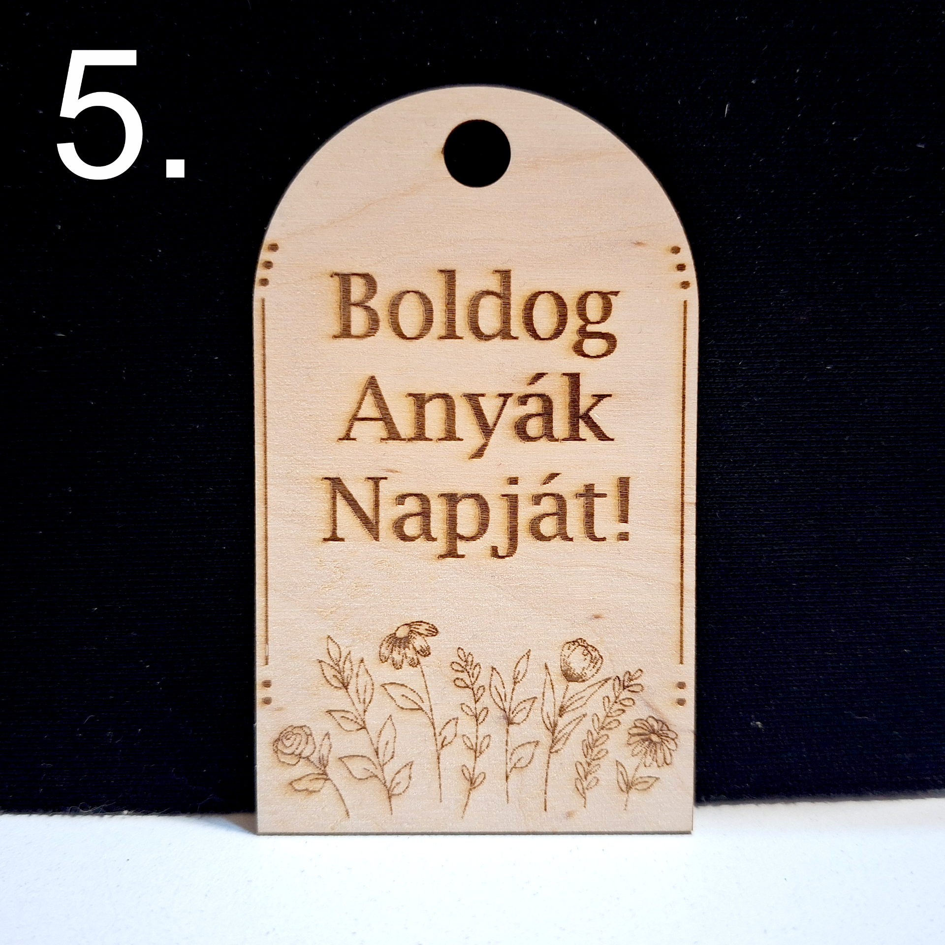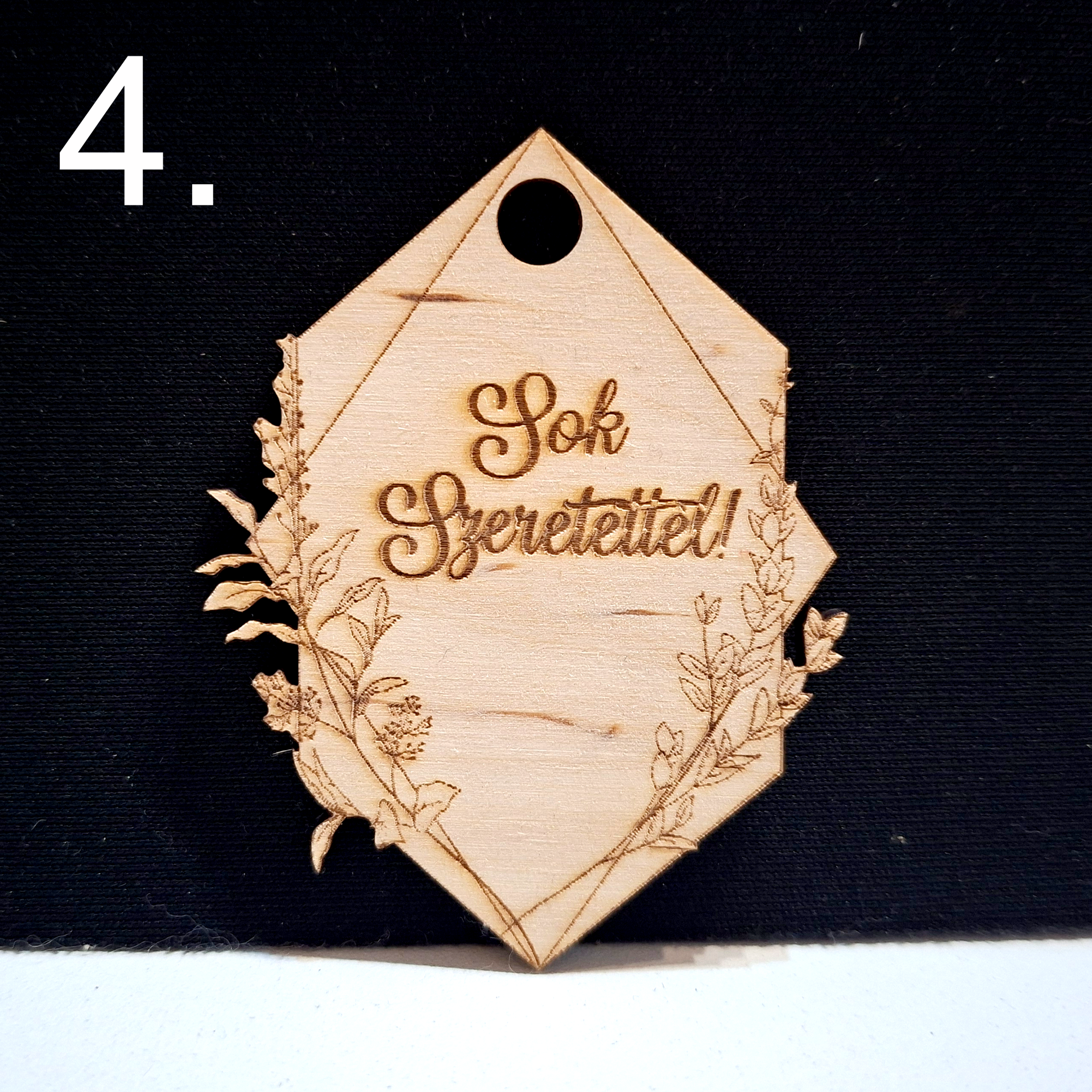 Fehér fából kivágott szív alakú tábla gravírozott felirattal és mintával.