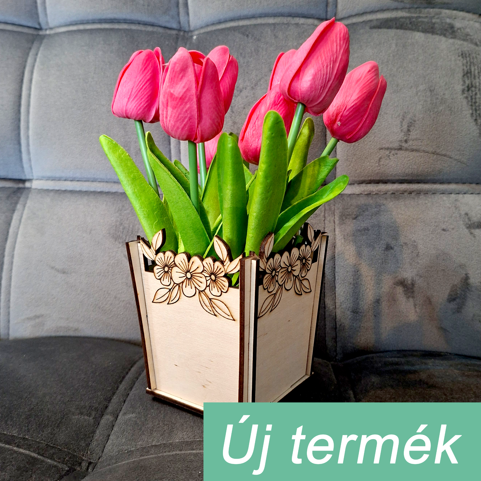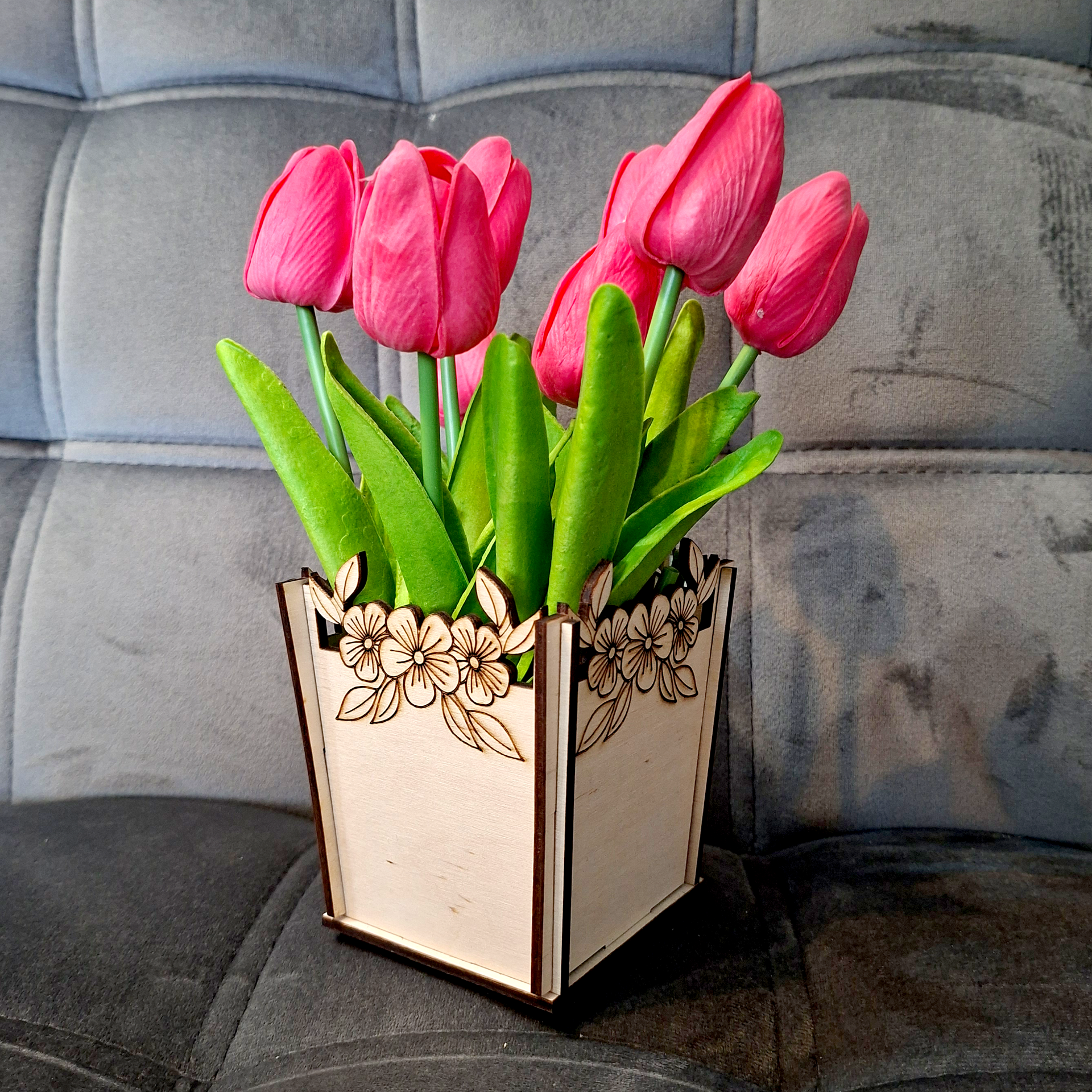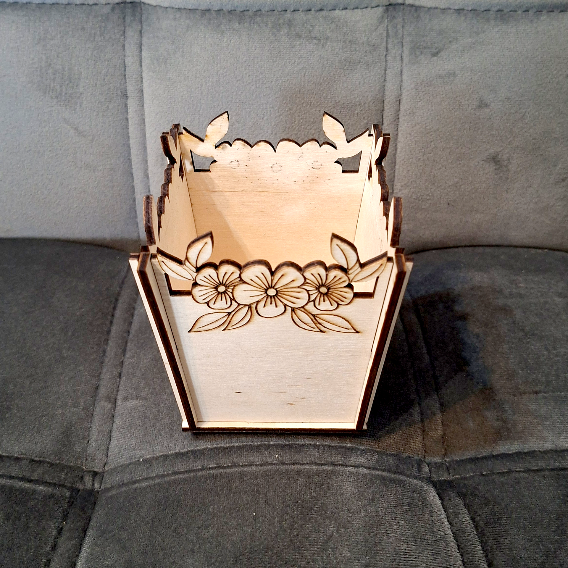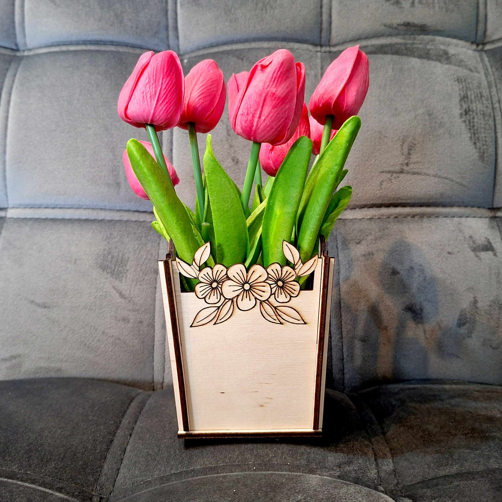 Lézervágott fa virágtartó kaspó, amely tökéletes élő vagy művirágok elhelyezésére, miközben dekoratív hangulatot teremt.