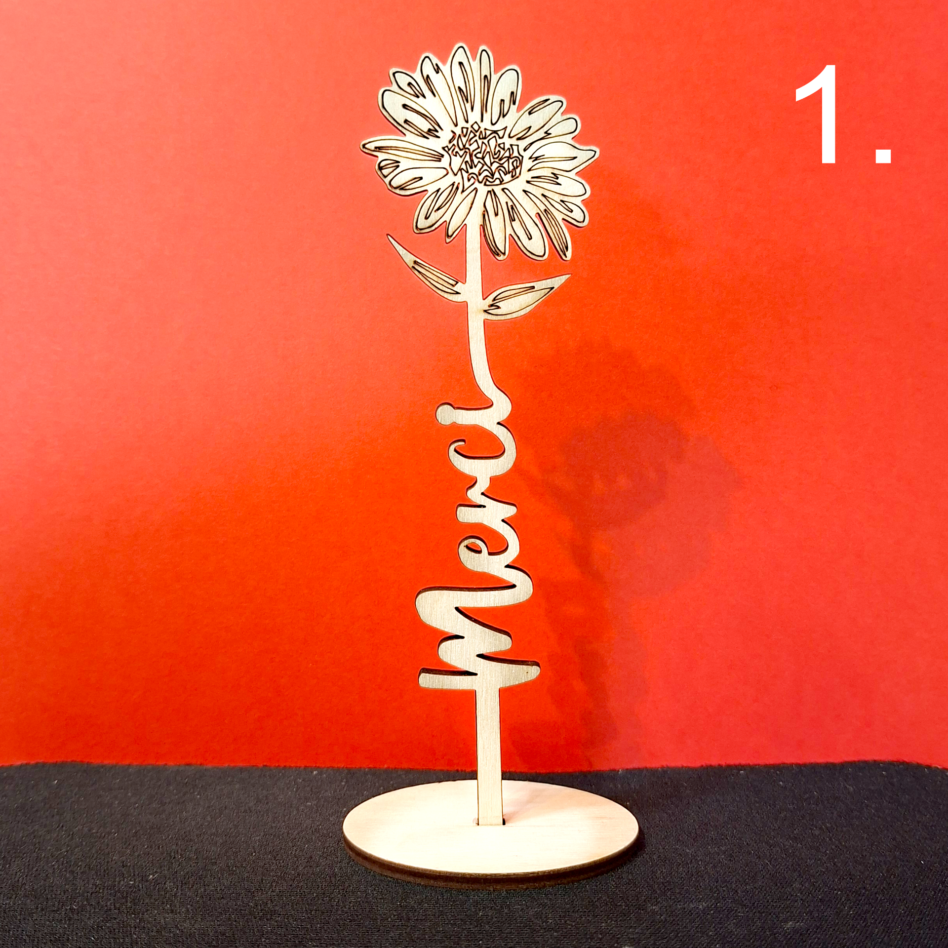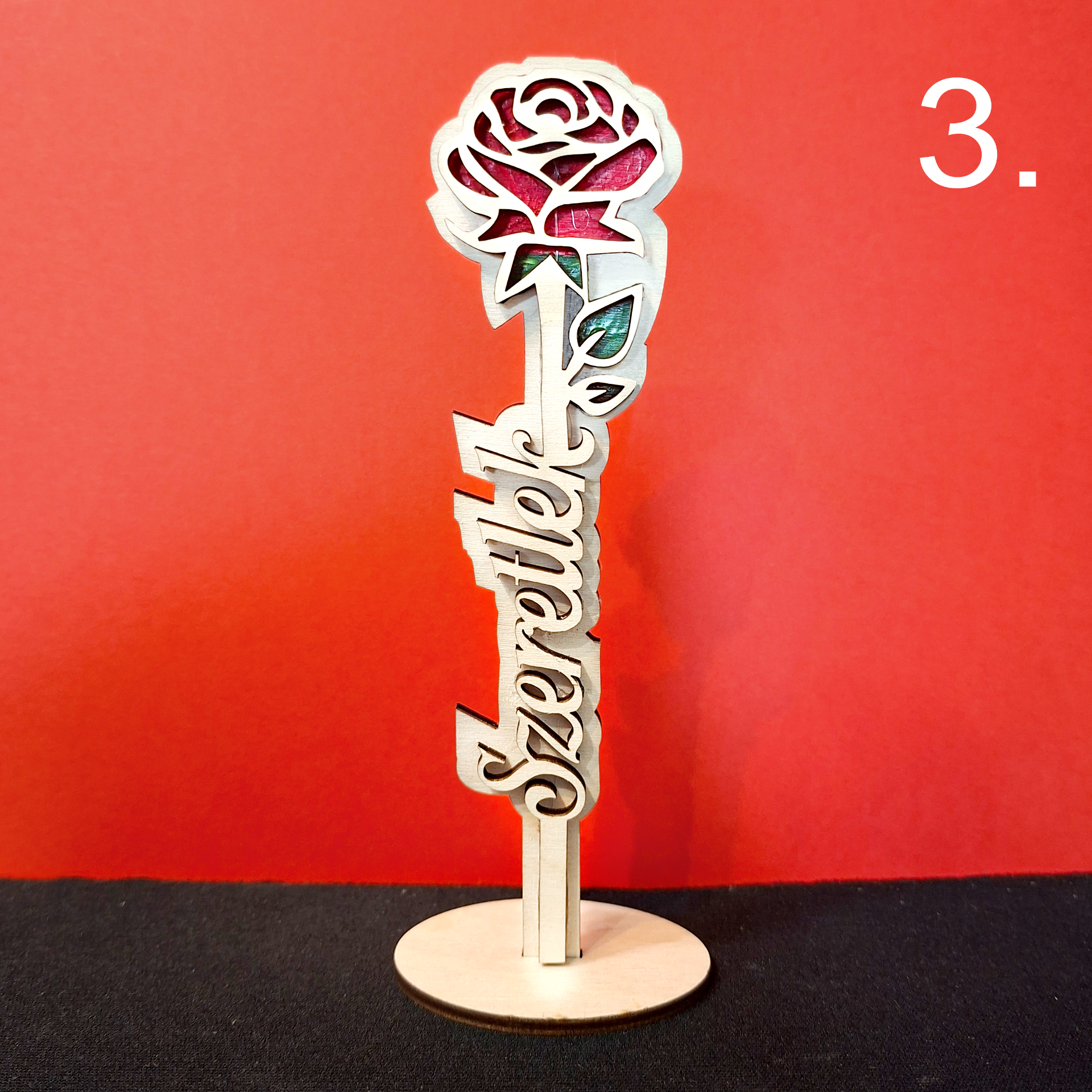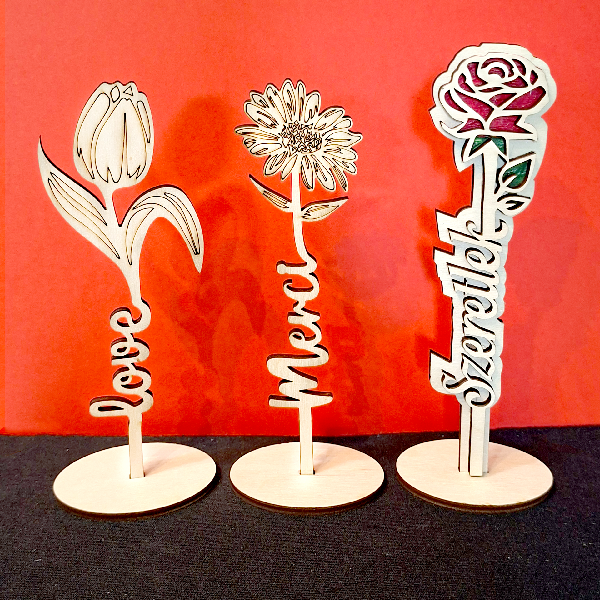 Személyre szabható, fa virág névvel vagy rövid felirattal. Letisztult, természetes megjelenésű dekoráció. Tökéletes ajándék Anyák napjára, névnapra, születésnapra vagy pedagógusoknak.