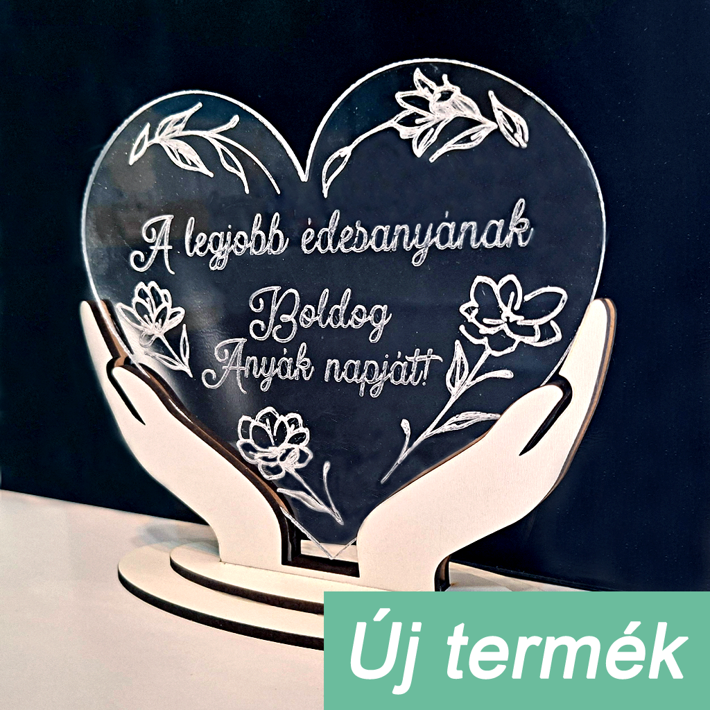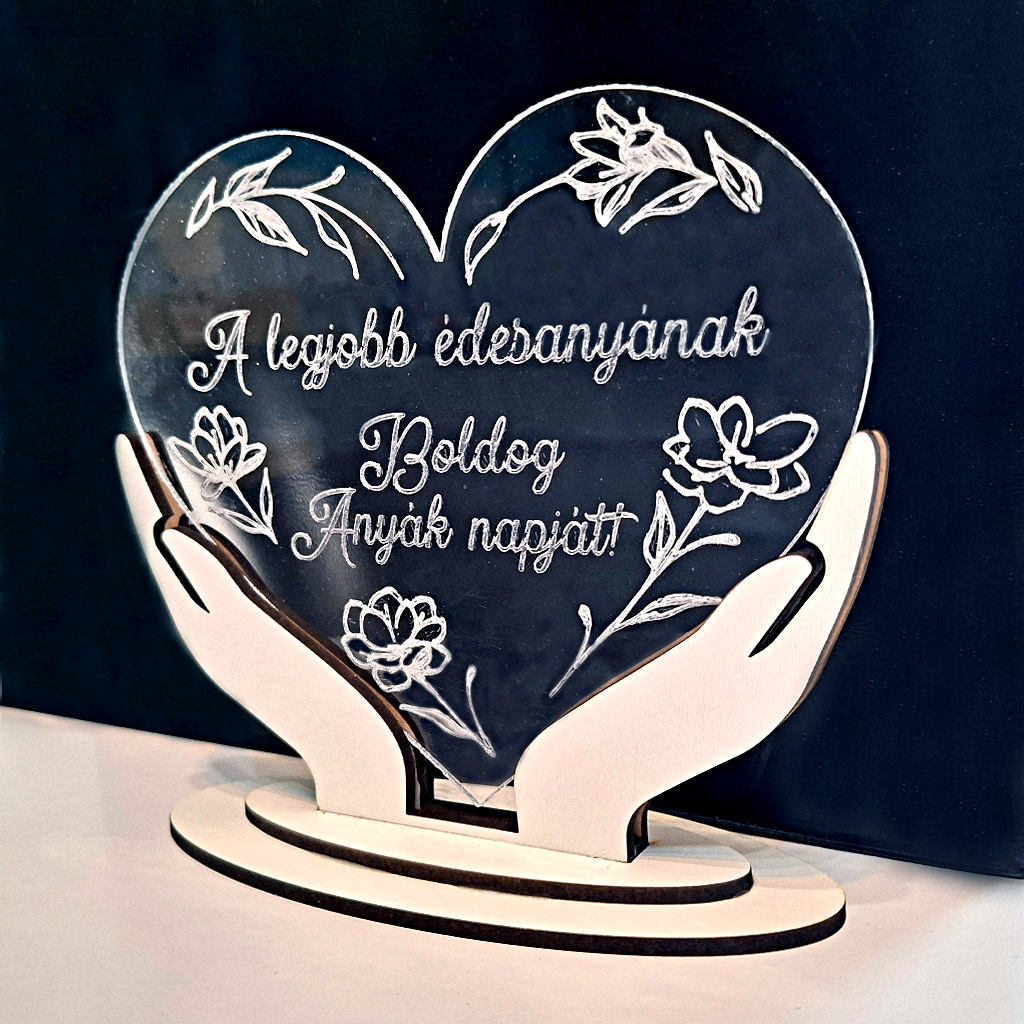 Elegáns, szív alakú plexi dísz gravírozott felirattal, amely tökéletes ajándék Anyák napjára.