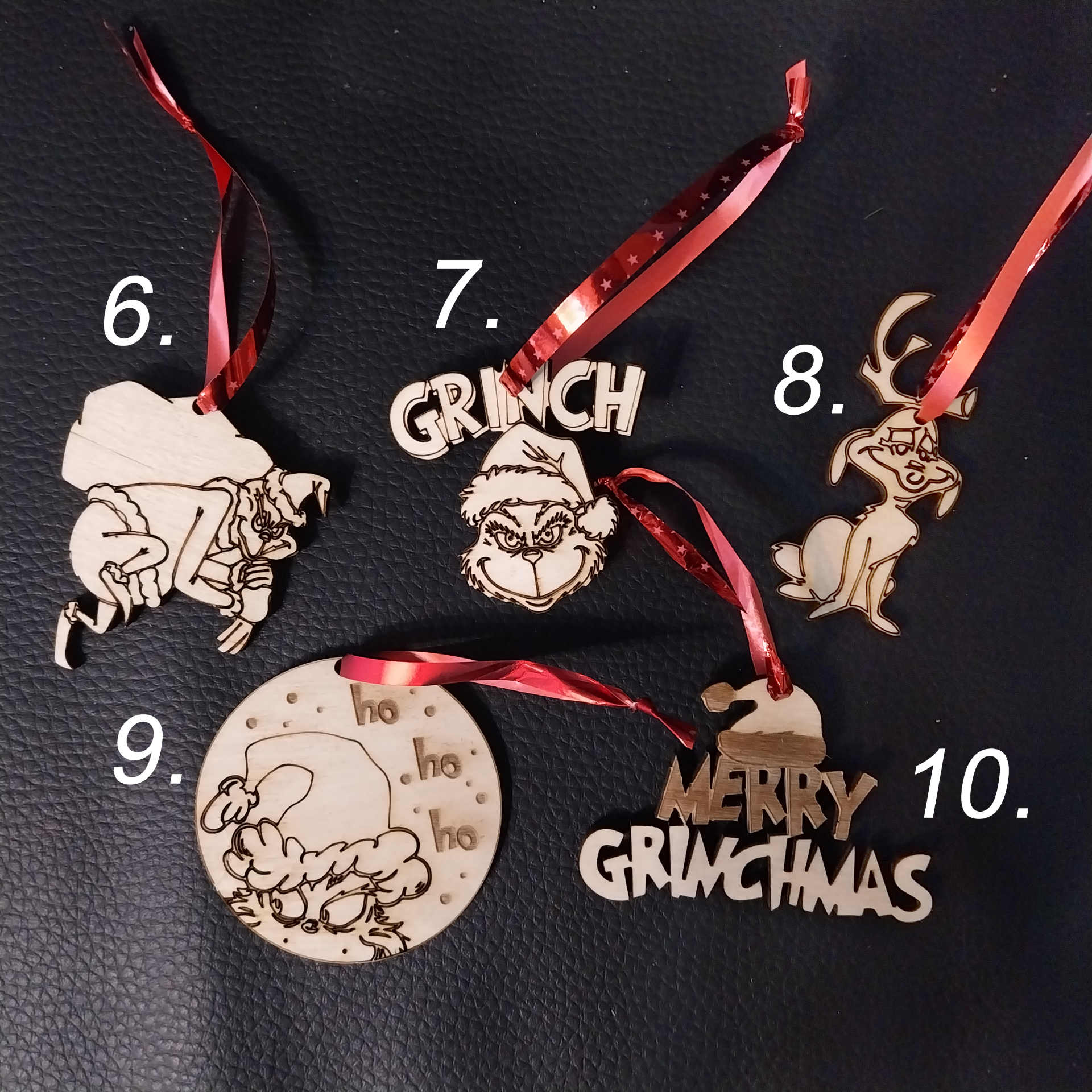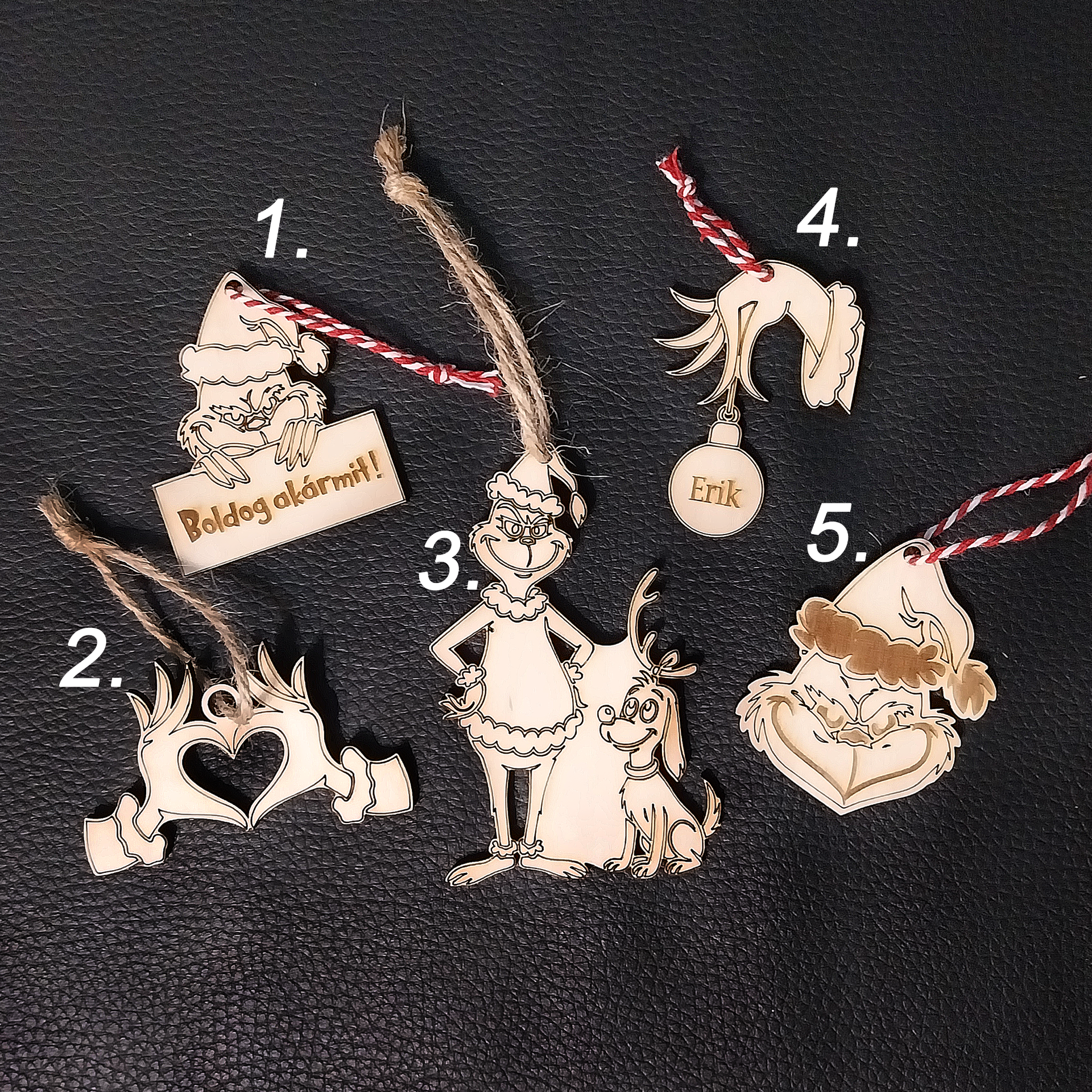 Humoros, gravírozott fa karácsonyfadísz Grincs mintával – tökéletes választás azoknak, akik egy kis játékosságot vinnének az ünnepi dekorba.